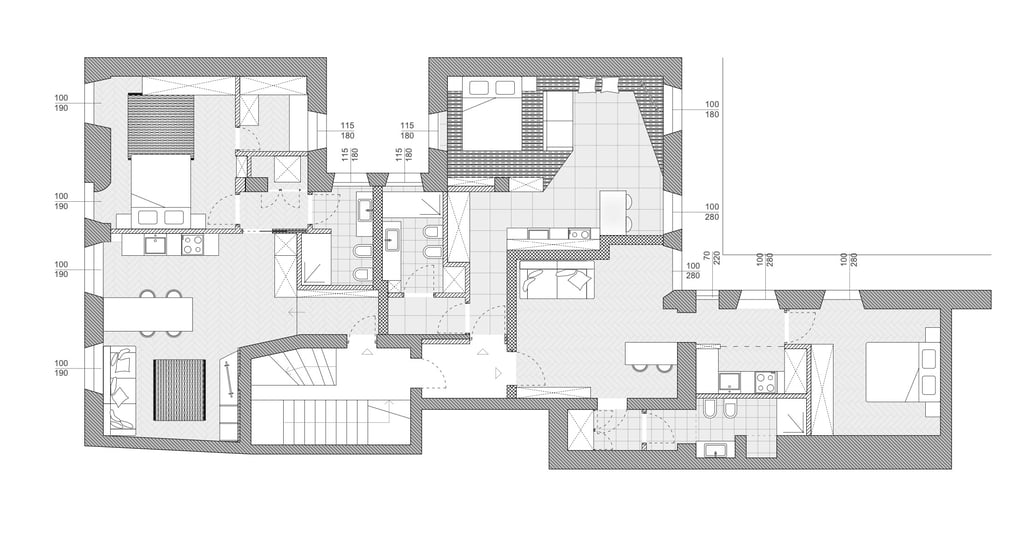 L'intervento prevede il totale rifacimento degli impianti e la loro divisione per i 3 appartamenti, oltre che a un totale ammodernamento delle finiture interne.