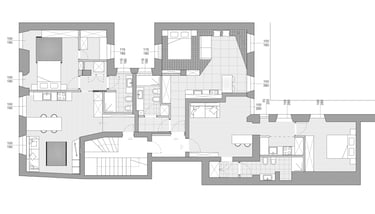 Il progetto prevede un frazionamento in 2 bilocali e un monolocale, sfruttando la presenza di un doppio ingresso e l'inserimento di una bussola di distribuzione.