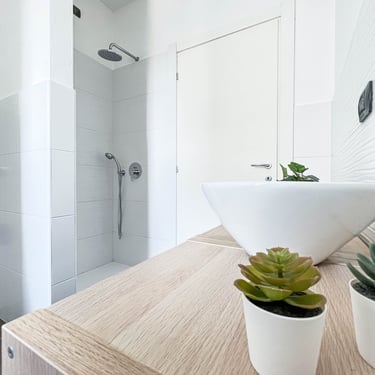 La ristrutturazione è quindi stata molto leggera e ha interessato principalmente il bagno, che è stato rifatto totalmente e le porte che sono state tutte sostituite. Mentre per la pavimentazione e gli infissi, abbiamo preferito mantenere quelli esistenti.