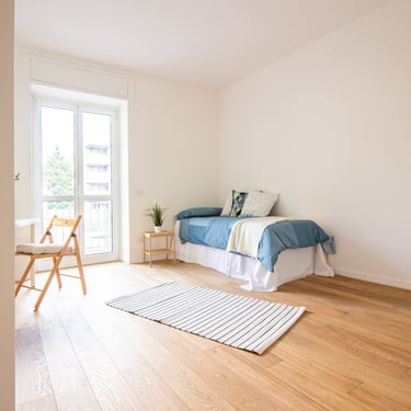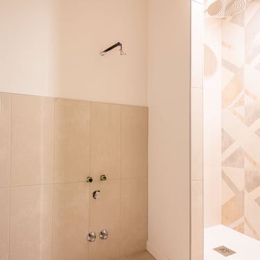 Siamo così riusciti a ottenere un ampio trilocale con una funzionale cucina a vista e doppi servizi con doccia.